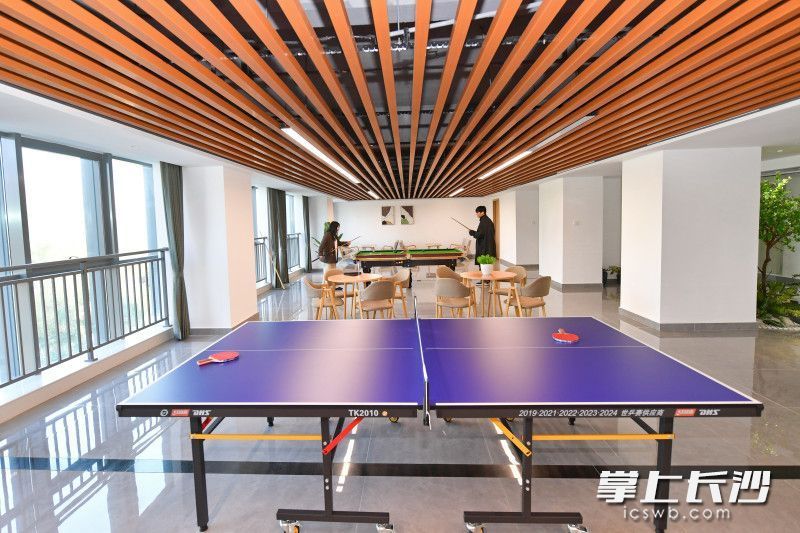 长沙新青年人才驿站(马栏山站)三楼邻里共享活动室、书吧、运动室、干洗房,配备有沙发、会议桌、投影仪、台球桌、乒乓球桌等。王志伟 摄